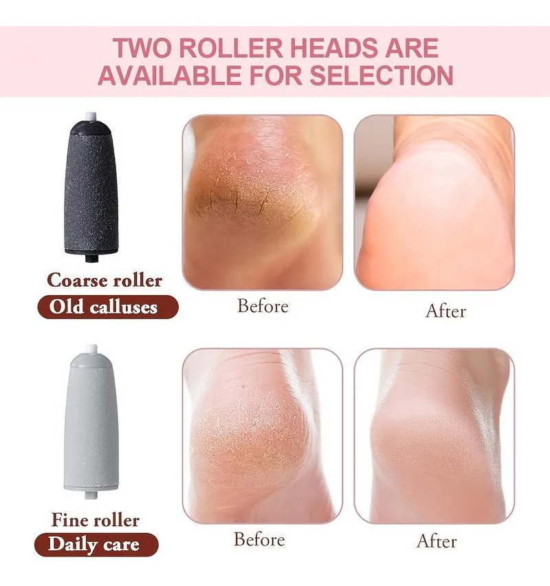 Incluye 2 rodillos: para remover piel dura y para suavizar y pulir los pies.