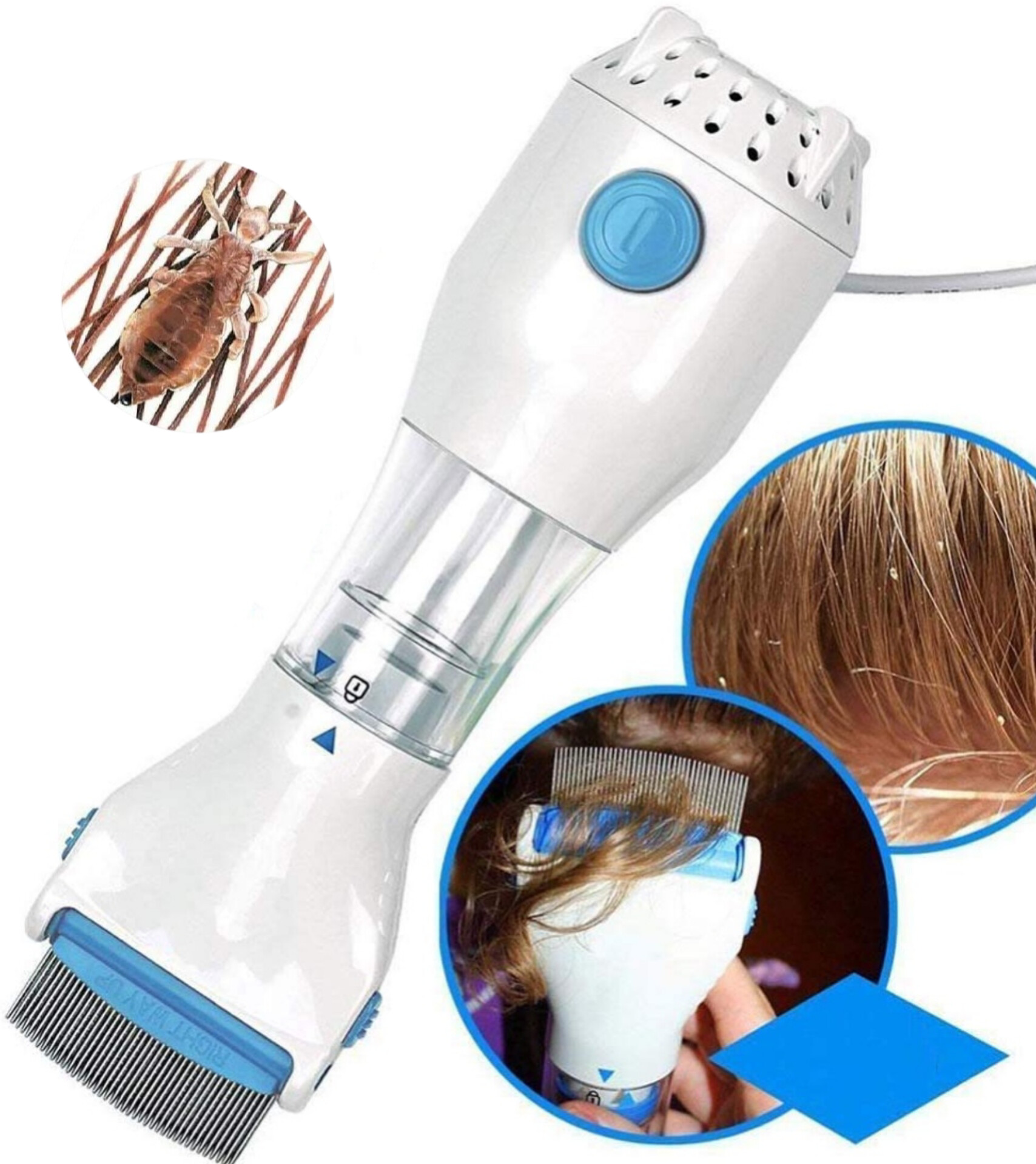 Dispositivo eléctrico para la eliminación de piojos y liendres que combina peinado con succión.